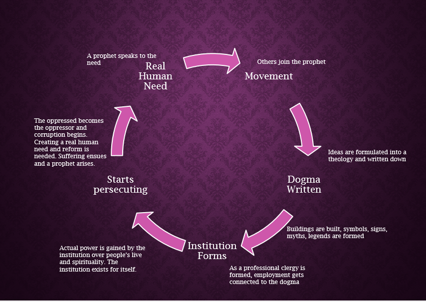 In the prison context that I currently minister in, I minister to unchurched and barely churched most of the time. I often get the question, “why are there so many denominations?” There are many answers to that question but last night I drew this on the board to illustrate how movements become institutions in need of reform become movements that become institutions in need of reform, become movements….